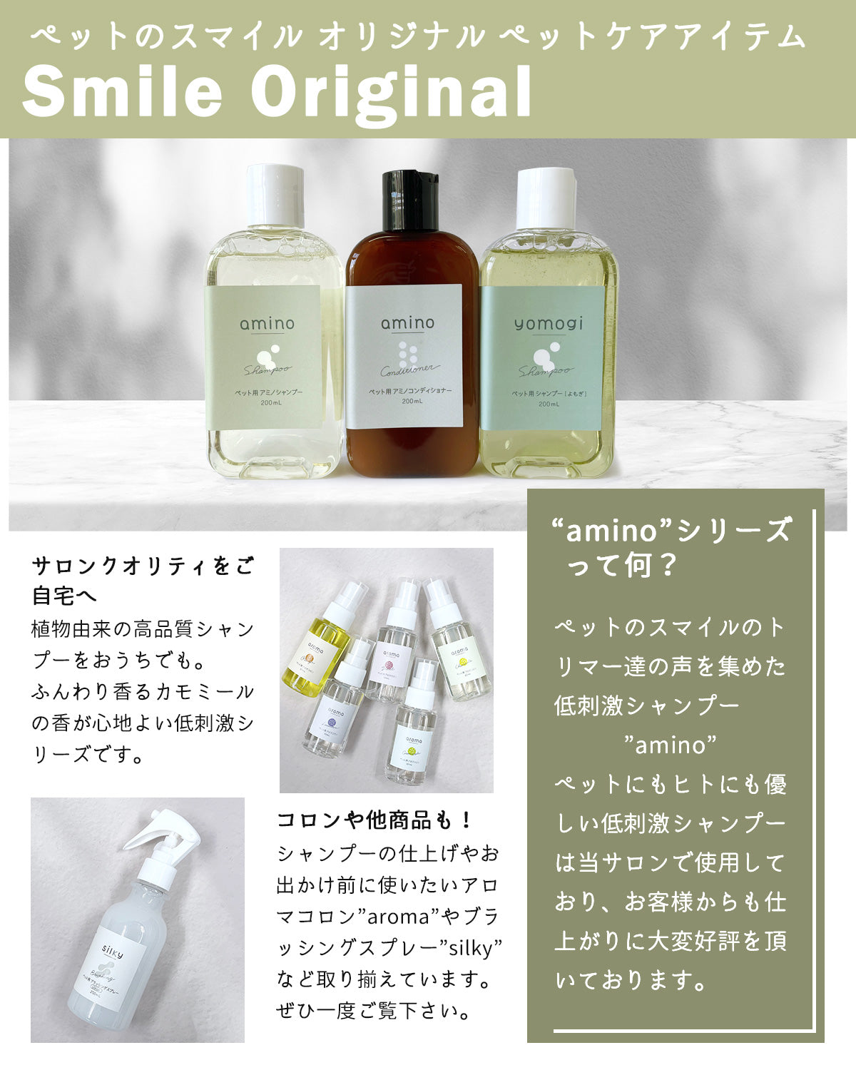 実店舗【ペットのスマイル】で使用しているアミノ酸たっぷりのサロンクオリティーオリジナルペットケア商品をご自宅までお届けします。